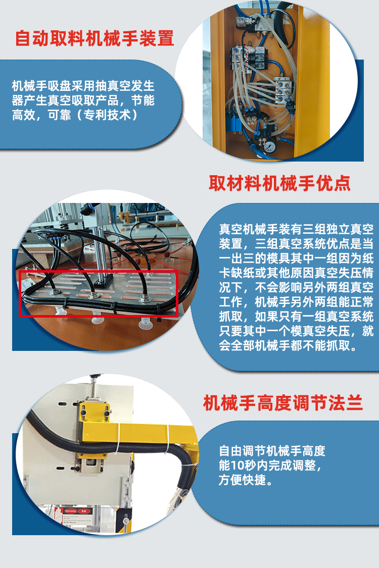 自动吸塑封口机此机具有机械手自动取料,这样就可以减少操作人员,代替了人工,(一台自动的机器可以节省半年的人工费用) 全自动带机械手吸塑封口机比普通吸塑封口机提高一半工作效率。产量稳定,不会因操作人员的变动而使产量降低。