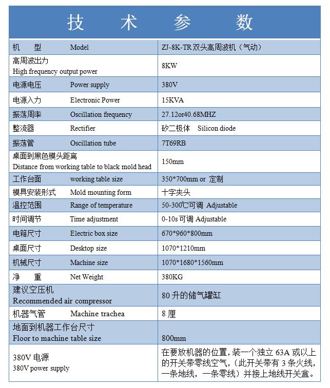 金条包装双头高周波机型号为ZJ-8K-TR,此机装有防火花保护装置,对高周波模具及生产产品起到很大的保护作用,是一款双头脚踩高周波机机器质量已通过欧盟CE质量出口检测,ISO9001机器质量检测;并对客户的样板提供免费打板打样,传授产品生产整过程工序及提供生产方案。