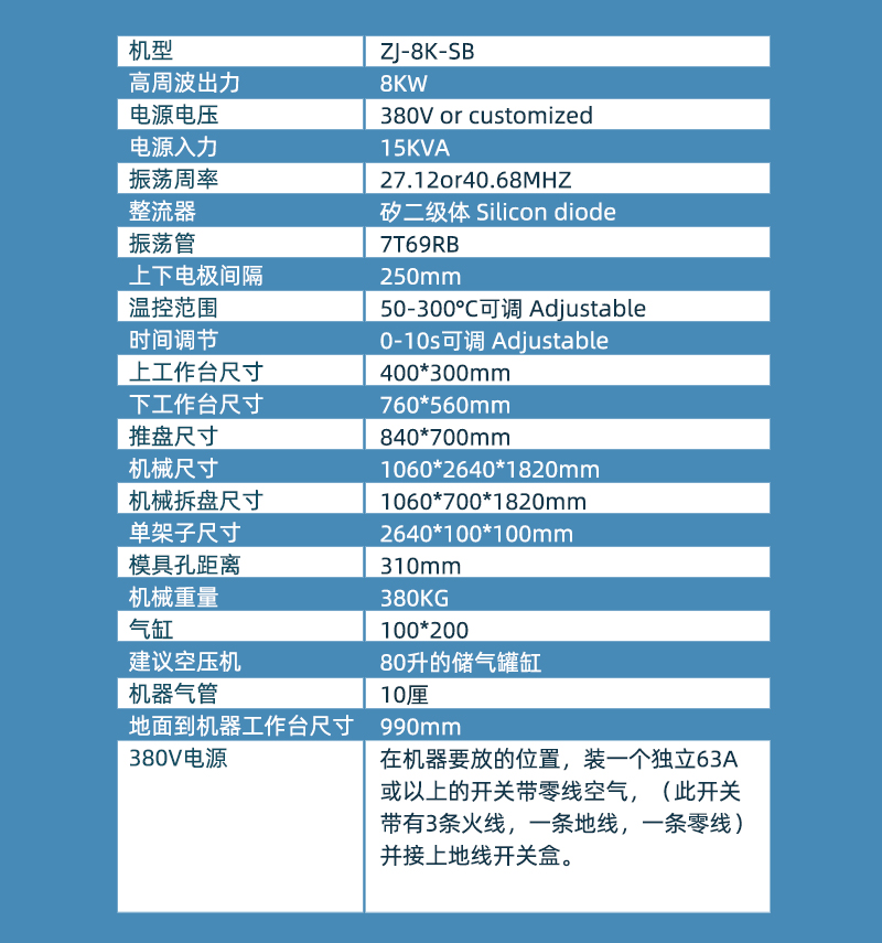 单头推盘式高周波机型号为ZJ-8K-SB,这款机器装有进口双管防火花保护装置,对高周波模具及生产产品起到很大的保护作用,可以把模具打火机率降低95%,是一款推盘式高周波机,可以单人操作,节约人工。机器由振嘉机械设备有限公司高周波生产厂家专业制造,机器质量已通过欧盟CE质量出口检测和ISO9001机器质量检测;