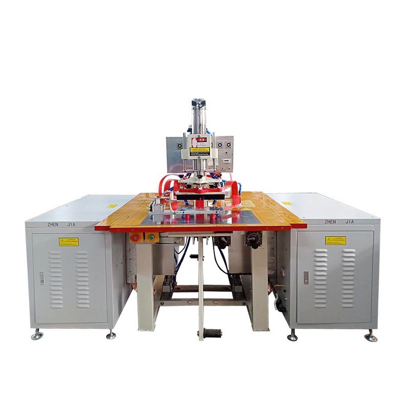双头气动双电箱高周波机:操作工作台面板分别为机头的两边,操作方式主要是由操作人员右脚踏定位和左脚开关,焊接过程由时间自动控制,2个电箱好处左右可以同时使用。